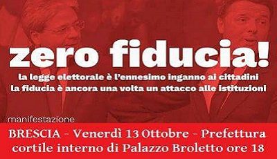 In risposta alla decisione del governo di porre la questione di fiducia per la approvazione della legge elettorale, la sinistra bresciana Articolo 1 MDP, Sinistra italiana, Possibile, PCI e Rifondazione comunista organizzano il presidio di protesta a difesa della democrazia di fronte alla prefettura.